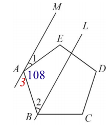 $$M//L\Rightarrow \angle 2=\angle 3\Rightarrow \angle 1= 180^\circ-\angle 3-108^\circ(正五邊形內角為108^\circ)\\=72^\circ-45^\circ=27^\circ,故選\bbox[red,2pt]{(A)}。$$