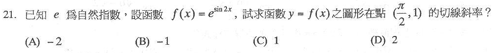 解:$$f\left( x \right) ={ e }^{ \sin { 2x } }\Rightarrow f'\left( x \right) ={ 2\cos { 2x } e }^{ \sin { 2x } }\Rightarrow f'\left( \frac { \pi }{ 2 } \right) =-2,故選\bbox[red,2pt]{(A)}。$$