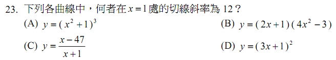 先對x微分,再將x=1代入求y值是否為12$$\left( A \right) y={ \left( { x }^{ 2 }+1 \right) }^{ 3 }\Rightarrow y'=6x{ \left( { x }^{ 2 }+1 \right) }^{ 2 }\Rightarrow y'(1)=24\\ \left( B \right) y={ \left( 2x+1 \right) \left( { 4x }^{ 2 }-3 \right) }\Rightarrow y'=2{ \left( { 4x }^{ 2 }-3 \right) }+8x\left( 2x+1 \right) \Rightarrow y'(1)=26\\ \left( C \right) y=\frac { x-47 }{ x+1 } \Rightarrow y'=\frac { 1 }{ x+1 } -\frac { x-47 }{ { \left( x+1 \right) }^{ 2 } } \Rightarrow y'(1)=12\\ \left( D \right) y={ \left( 3x+1 \right) }^{ 2 }\Rightarrow y'=6(3x+1)\Rightarrow y'(1)=24,\\故選\bbox[red,2pt]{(C)}。$$