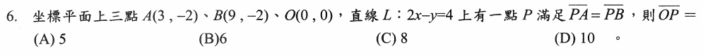所以 P=(6,12-4)=(6,8),P至原點距離=10,故選\(\bbox[red,2pt]{(D)}\)