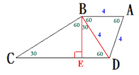 梯形面積=\(\frac{(\overline{AB}+\overline{CD})\overline{BE}}{2}=\frac{(4+8)\times2\sqrt{3}}{2}=12\sqrt{3}\)