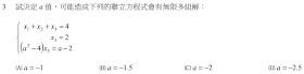 解:$$\begin{cases} x_{ 1 }+x_{ 2 }+x_{ 3 }=4\cdots (1) \\ x_{ 3 }=2\cdots \cdots \cdots \cdots \left( 2 \right) \\ \left( a^{ 2 }-4 \right) x_{ 3 }=a-2\cdots \left( 3 \right) \end{cases}(2)=(3)\Rightarrow x_{ 3 }=\frac { a-2 }{ a^{ 2 }-4 } =\frac { 1 }{ a+2 } =2\Rightarrow a=-\frac { 3 }{ 2 } ,故選\bbox[red,2pt]{(B)}$$