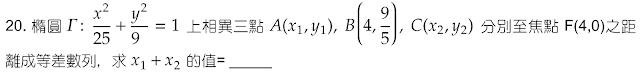 解答:$$A(x_1,y_1) 在\Gamma上\Rightarrow {x_1^2\over 25} +{y_1^2\over 9}=1 \Rightarrow y_1^2= 9-{9\over 25}x_1^2;同理y_2^2=9-{9\over 25}x_2^2\\ 因此\cases{\overline{AF}=\sqrt{(x_1-4)^2+y_1^2} =\sqrt{(x_1-4)^2+9-{9\over 25}x_1^2} ={4\over 5}\sqrt{(x_1-{25\over 4})^2}\\ \overline{BF}=9/5\\ \overline{CF}={4\over 5}\sqrt{(x_2-{25\over 4})^2} }\\ 由於A,B皆在橢圓上,因此-4\le x_1,x_2\le 4 \Rightarrow \cases{x_1-{25\over 4} \lt 0 \\ x_2-{25\over 4}\lt 0} \Rightarrow \cases{\overline {AF} = {4\over 5}({25\over 4}-x_1) \\ \overline{BF} ={4\over 5}({25\over 4}-x_2)}\\ \overline{AF},\overline{BF},\overline{CF} 等差\Rightarrow \overline{AF}+\overline{CF} =2\overline{BF} \Rightarrow {4\over 5}({25\over 2}-x_1-x_2) ={18\over 5} \\ \Rightarrow {25\over 2}-x_1-x_2={9\over 2} \Rightarrow x_1+x_2 = {25\over 2}-{9\over 2} =\bbox[red, 2pt]{8}$$