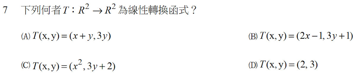 解答:$$(B)(C)(D) 均不符合T(0,0)=(0,0),非線性轉換,故選\bbox[red,2pt]{(A)}$$