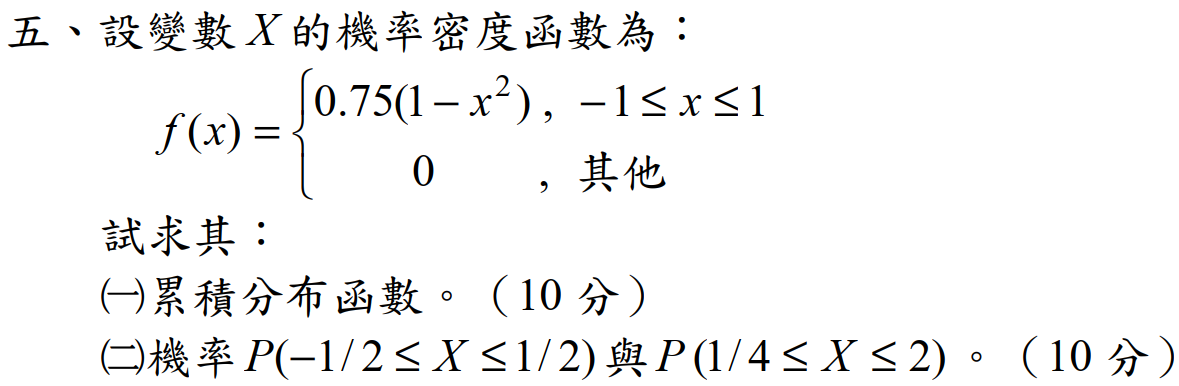 (一)$$累積分佈函數F(x)=f(X\le x) =\int_{-1}^x f(x)\;dx =\int_{-1}^x {3\over 4}(1-x^2)\;dx = -{1\over 4}x^3+{3\over 4}x+{1\over 2} \\ \Rightarrow \bbox[red,2pt]{F(x)=\begin{cases}-{1\over 4}x^3+{3\over 4}x+{1\over 2}, & -1\le x\le 1\\ 0, &其它 \end{cases}};$$(二)$$P(-1/2\le X\le 1/2)= F(1/2)-F(-1/2) = -{1\over 16}+{3\over 4} = {11\over 16}\\ P(1/4\le X\le 2) =F(1)-F(1/4) =1 - {175\over 256}= {81\over 256} \\ \Rightarrow \bbox[red,2pt]{\cases{P(-1/2\le X\le 1/2)={11\over 16} \\ P(1/4\le X\le 2) = {81\over 256} }}$$