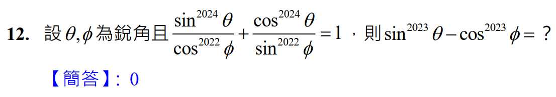 解答:$$\left(\left({\sin^{1012} \theta\over \cos^{1011} \phi} \right)^2+ \left({\cos^{1012} \theta\over \sin^{1011} \phi} \right)^2\right) \left( \left({\cos^{1011} \phi\over \sin^{1010} \theta} \right)^2+ \left({\sin^{1011} \phi\over \cos^{1010} \theta} \right)^2 \right) \ge \left( \sin^2 \theta+ \cos^2 \theta\right)^2\\ \Rightarrow 1\cdot \left( \left({\cos^{1011} \phi\over \sin^{1010} \theta} \right)^2+ \left({\sin^{1011} \phi\over \cos^{1010} \theta} \right)^2 \right) \ge 1 \Rightarrow \left({\cos^{1011} \phi\over \sin^{1010} \theta} \right)^2+ \left({\sin^{1011} \phi\over \cos^{1010} \theta} \right)^2=1\\ 此時 {\sin ^{2022}\theta \over \cos^{2022}\phi} ={\cos^{2022} \theta \over \sin^{2022} \phi} \Rightarrow \sin\theta \sin \phi=\cos \theta\cos \phi \Rightarrow \cos(\theta+\phi)=0 \Rightarrow \theta+\phi ={\pi\over 2} \\ \Rightarrow \sin \theta= \sin({\pi\over 2}-\phi)= \cos \phi \Rightarrow \sin^{2023} \theta-\cos^{2023} \phi =\bbox[red, 2pt]0$$